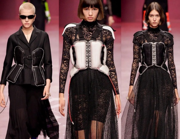 Mănuși și jachete în stil motociclist care contrastau cu eleganța și fluiditatea unei rochii de seară grozave. Costumul Bar a fost imaginat într-o nouă versiune, transformându-și structura originală într-un sistem care încălzește și reglează umiditatea corpului datorită tehnicilor dezvoltate împreună cu D-Air lab, în timp ce o jachetă din puf mozaic este combinată cu o curea și îmbrăcăminte sport.