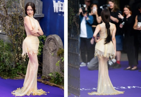 Încă de la primele fotografii de pe covorul roșu, un lucru e clar: Jenna Ortega nu joacă cartea nostalgiei. Nu imită stilul gotic al anilor '90 și nici nu se închide într-o caricatură. Se reinventează. Stilul ei gotic este minimalist, arhitectural, precis. Fără supraîncărcare, fără zgomot vizual. Negru, da, dar nu numai atât, cu un joc de texturi multiple: dantelă victoriană, corsete, piele netedă, tul fluid. Fiecare ținută pare să provină dintr-o poveste crudă undeva între baroc și post-punk, dar spusă în era digitală, prin prisma unei lumi hiperconectate.