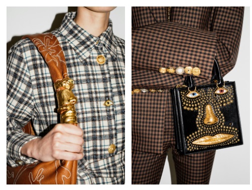 Aceste bijuterii asemănătoare nasturilor nu se limitează la articolele prêt-à-porter: ele împodobesc și gențile emblematice ale sezonului, The Face și The Secret. Montate pe piele, ele transformă obiectul utilitar într-o operă sculpturală, mutând funcția spre fantezie. Geanta devine o piesă de prezentare, iar gestul cotidian este impregnat de o strălucire aproape mitologică.