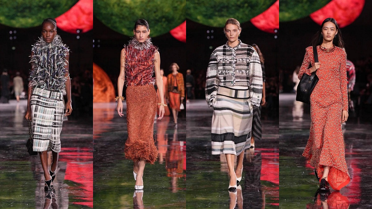 Un alt element iconic Chanel și-a făcut apariția pe tot parcursul colecției – tweed-ul. Pe acesta designerul l-a gândit în versiuni moderne, care se delimitează de look-ul clasic al taiorului Chanel, dar care păstrează totuși eleganța lui. Blazy propune compleuri din tweed cu tivurile nefinisate sau cu siluete pătrate marcate de tivuri vizibile – o viziune fresh asupra unui clasic. Rochiile din jerseu, o altă semnătură Chanel, și-au făcut locul în colecție în versiuni cu siluete fluide, care alunecă pe corp și se termină în volane.