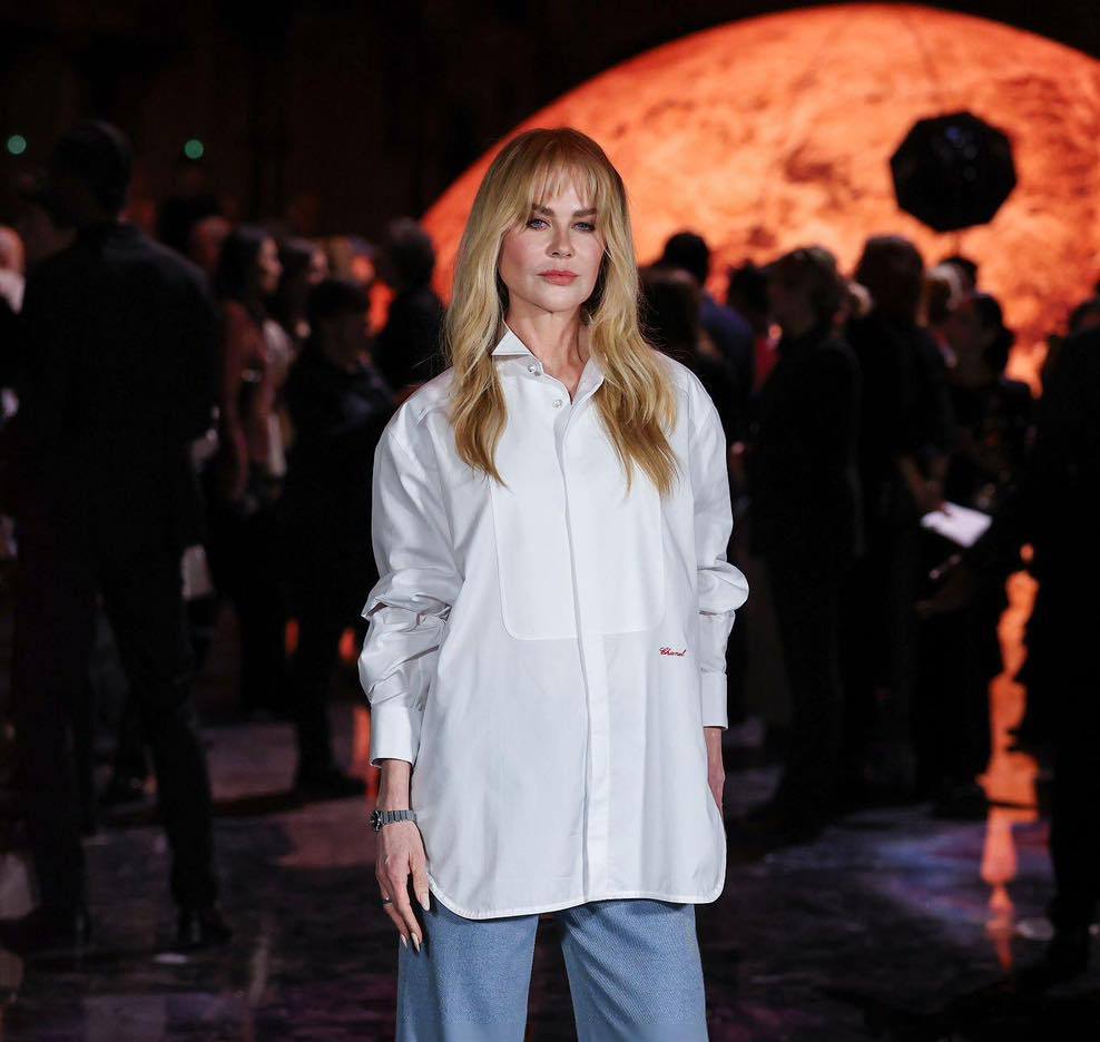 Nicole și fiicele sale, Sunday Rose și Faith Margaret Kidman Urban, au fost prezente la show-ul Chanel care a avut loc săptămâna trecută la Grand Palais, în cadrul Paris Fashion Week. Kidman a debutat un nou beauty look sub forma unei tunsori cu breton, iar ținuta sa a reflectat viziunea nouă a lui Blazy – un Chanel mai relaxat, mai modern și mai fresh. Actrița a purtat o cămașă albă, inspirată de cămășile bărbătești purtate pe dedesubtul fracurilor, alături de o pereche de jeanși cu croială largă și o poșetă purtată drept clutch.