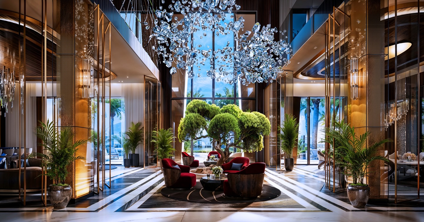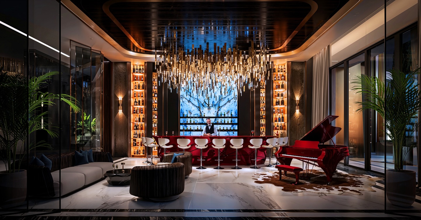 Proiectul a fost dezvoltat în colaborare cu o echipă de 14 designeri și opt arhitecți. Materialele au fost selectate din întreaga lume, inclusiv marmură de clasă triplu-A provenită dintr-o singură carieră italiană — un proces care a necesitat un an de așteptare pentru a asigura uniformitatea venaturii. În interior, un bar din onix domină zona principală de recepție, iar candelabrele italiene și cehe oferă o lumină spectaculoasă.