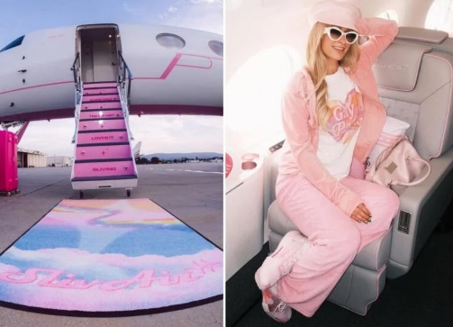 Explozia de roz pe care o întâlnești la exterior este reprodusă și în interior. Întregul avion este împodobit cu replicile lui Paris, cu jargonul ei și cu personalitatea ei. Un exemplu în acest sens: inițialele ei de pe fuselaj, „That's hot” scris pe coadă, „Sliv Air” pe burtă și „Paris xoxo”, astfel încât muritorii de rând de pe Pământ o pot privi pe această moștenitoare zburând deasupra capetelor lor. Totul merge până la cel mai insesizabil detaliu, cum ar fi înmatricularea N11PH, unde codul „PH” de pe coadă este o aluzie vicleană la inițialele ei.