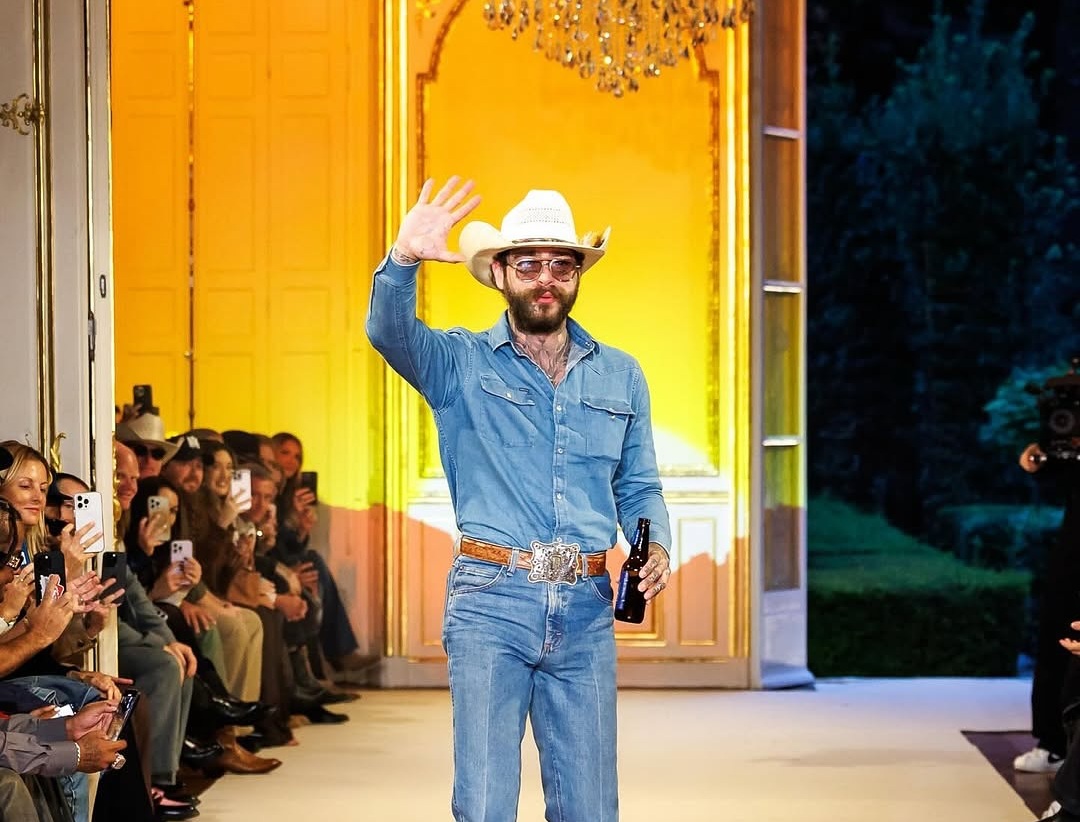 Post Malone și-a aruncat oficial pălăria în ringul internațional de modă, alături de cămăși din denim cu capse în față, jachete de piele cu franjuri, catarame de curea de mărimea unui roller-coaster - și un cal, care i-a adus look-ul final pe podium.