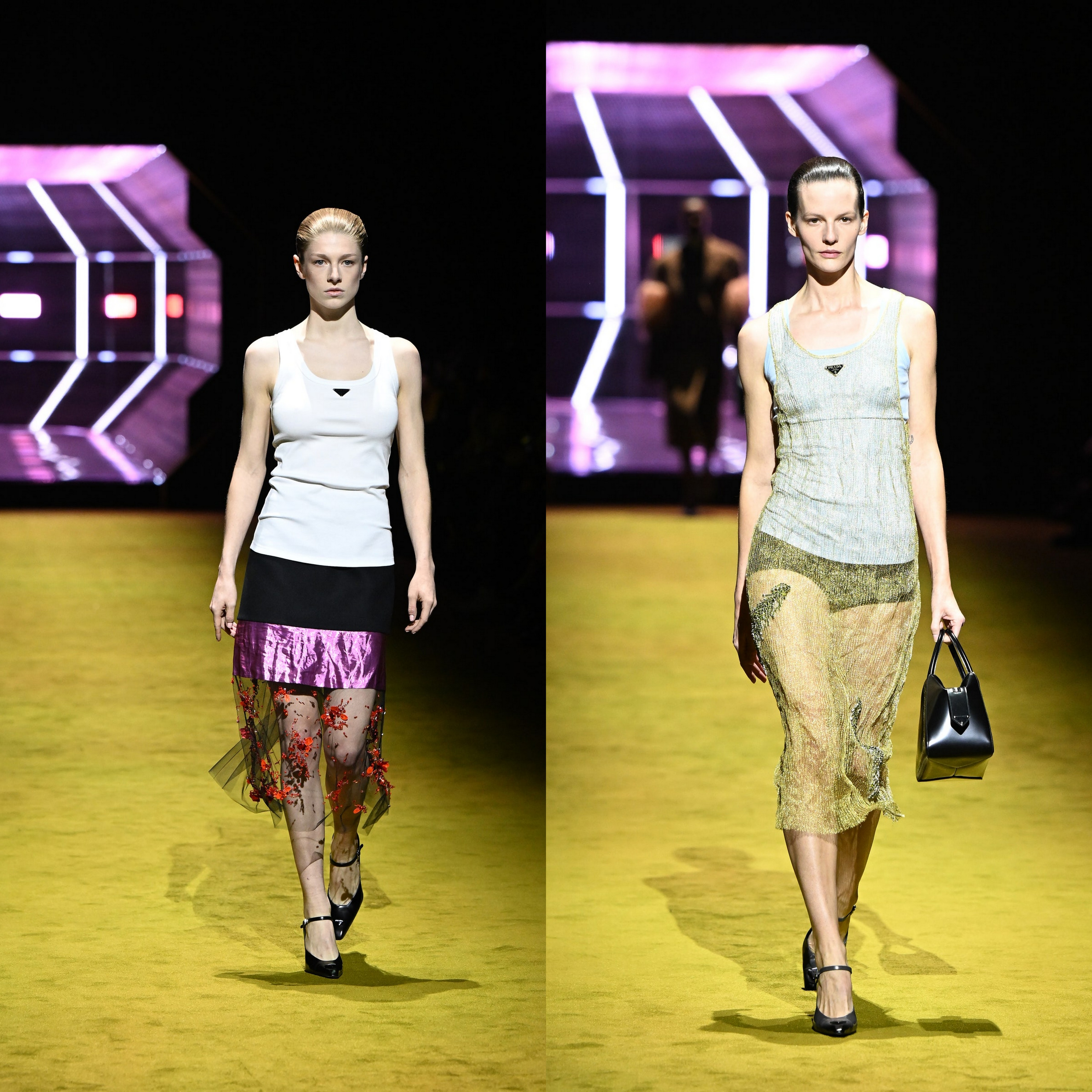 Din dorința de a crea o garderobă care să depășească convențiile, Prada își imaginează o nouă siluetă semnătură, în care caracteristicile îmbrăcămintei sport se combină cu rafinamentul unei fuste cu volume și materiale eterogene. Pentru seară, maioul își recapată glamourul. Și are succes.