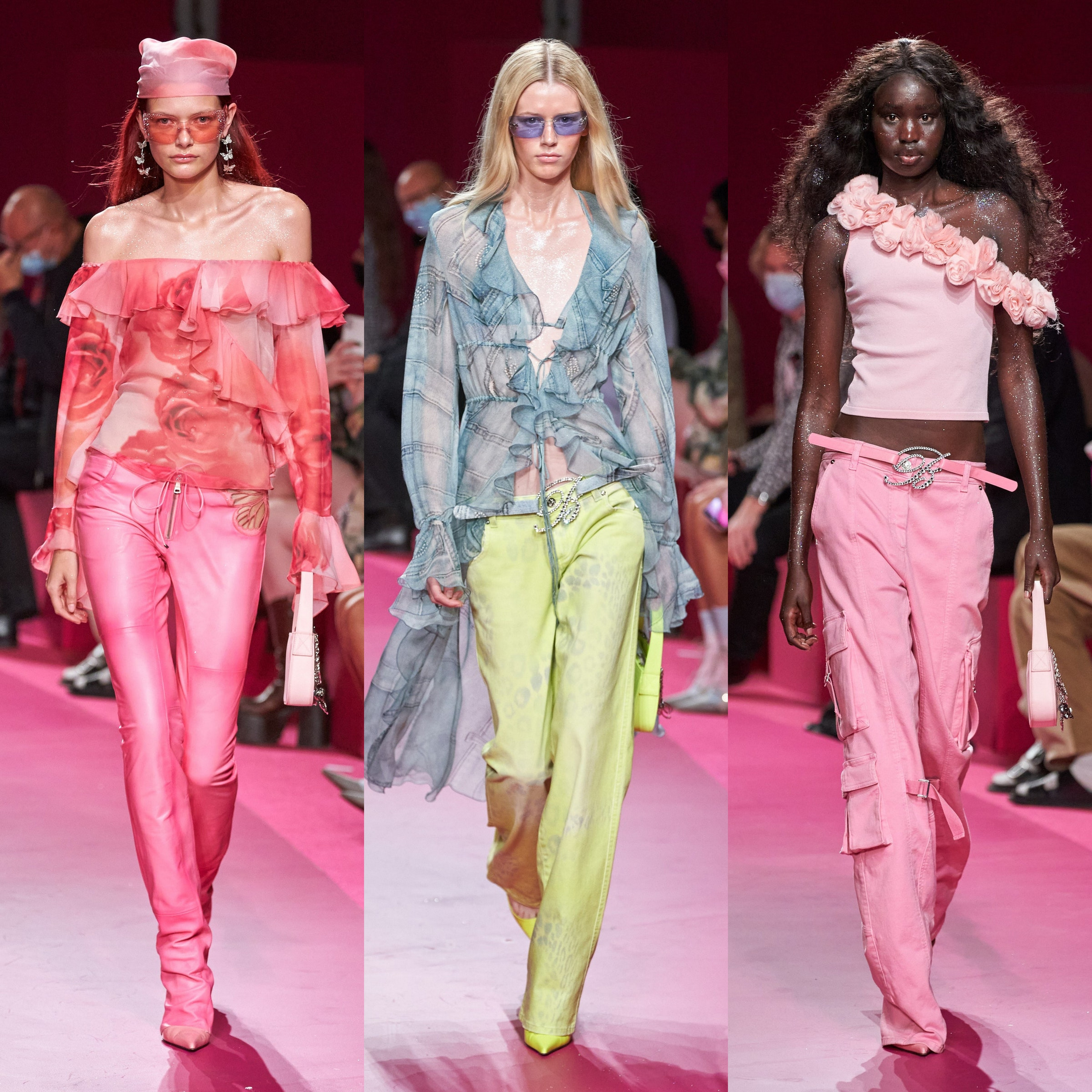 Modelele evocă glamour ul anilor 2000 dar și pe celebra Paris Hilton: culori feminine cu predilecție pentru roz (o nuanță care domină în spectacolul de primăvară-vară 2022). Nicola Brognano combină pantalonii cu talie joasă cu bluze de mătase foarte lejere și topuri florale asimetrice.
