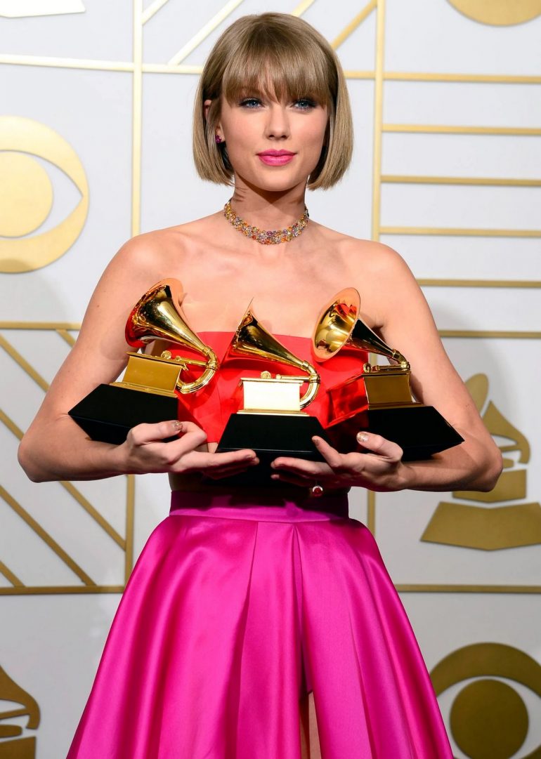 Lorraine Schwartz a fost marca de covor roșu preferată de Swift și de multe altele de-a lungul anilor. La premiile Grammy din 2016, cântăreața „Style” a sosit într-o ținută colorată din două piese: un top coral și o fustă decupată până la podea, de Atelier Versace, potrivit Billboard.