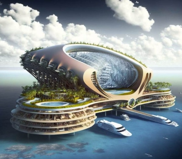 Numiți-le jumătate navă, jumătate stadion. Firma de arhitectură franceză își propune să construiască stadioanele plutitoare nu pe uscat, ci pe mare. Centrele comunitare cu emisii scăzute de carbon vor fi construite folosind materiale reciclate, cum ar fi lemn masiv, aluminiu reciclat, alge verzi și deșeuri de plastic de pe al 7-lea continent. De asemenea, va funcționa cu același principiu folosind doar surse de energie regenerabilă, cum ar fi radiația solară, energia eoliană și curenții oceanici pentru a naviga.