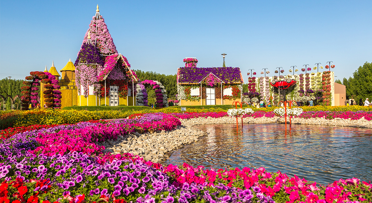 Cei responsabili cu amenajarea grădinii, au ales plantele cele mai rezistente la temperaturi ridicate astfel încât grădina să aibă un aspect proaspăt. Dubai Miracle Garden este împărțită pe mai multe sectoare cu diferite tematici. Florile sunt amenajate în formă de mașini, inimioare, delfini, ceasuri sau redau scene din povești celebre creând astfel un adevărat paradis pe pământ.