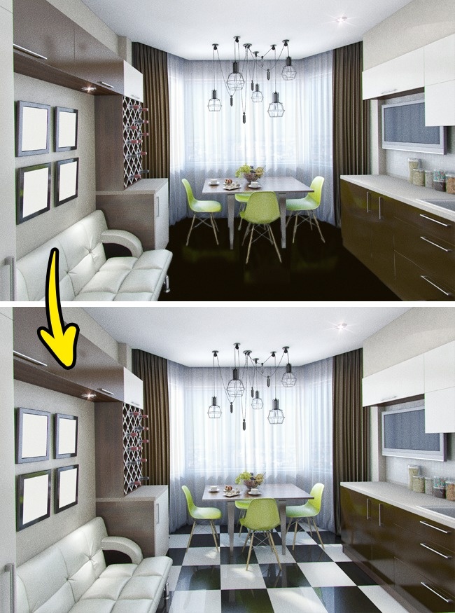 Îndrăzniți să experimentați nu numai cu mobilierul și accesoriile, ci și cu lucruri de bază precum podeaua. Amintiți-vă doar că o podea „activ” cere ca alte elemente să fie mai mult sau mai puțin neutre, pentru a nu lăsa totul să se transforme într-un amestec extravagant.