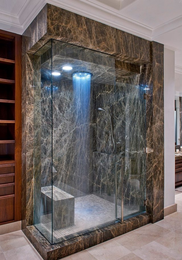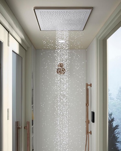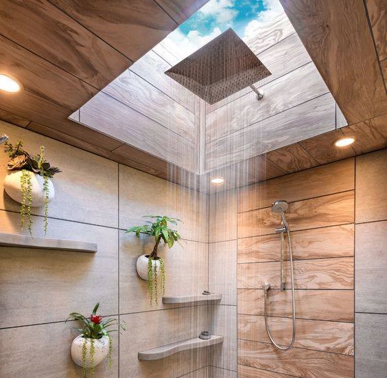 O soluție elegantă pentru iluminarea dușului. Poți obține acest aspect deosebit dacă locuiești la casă și își amenajezi baia la mansardă astfel încât lumina să cadă din tavan. Sau poți obține acest aspect folosindu-te de lumini și câteva imagini.