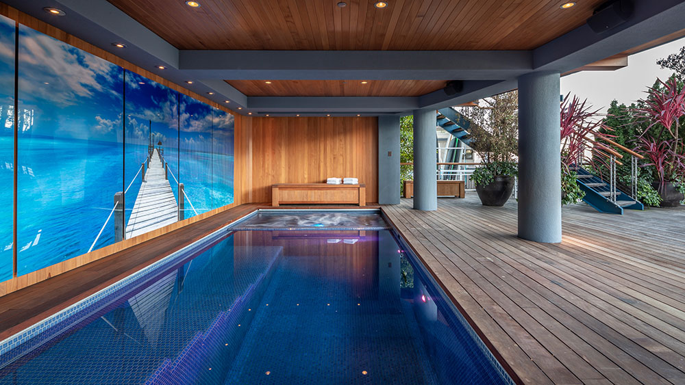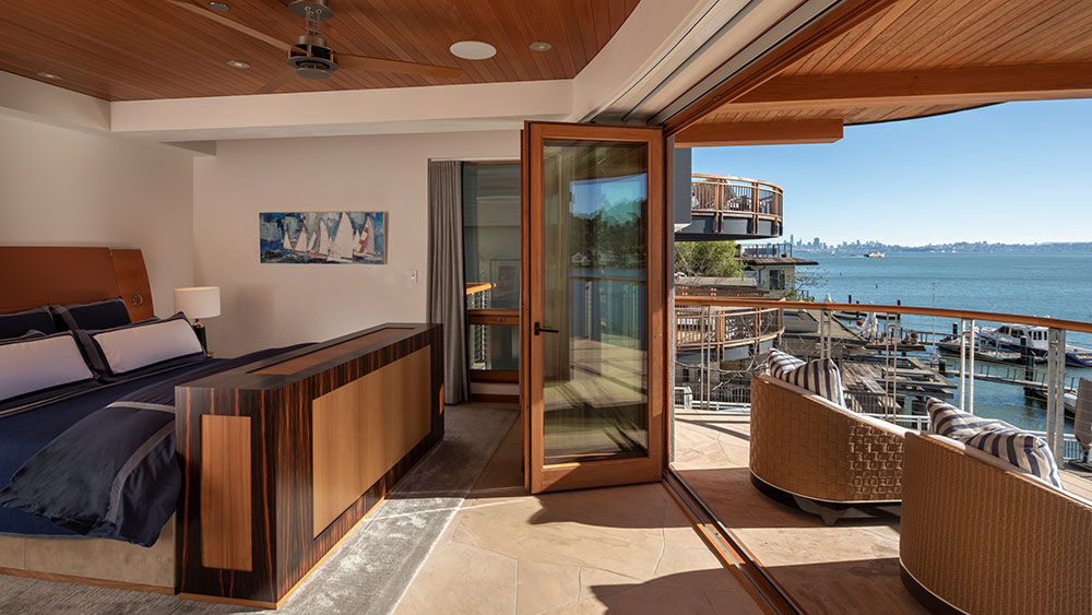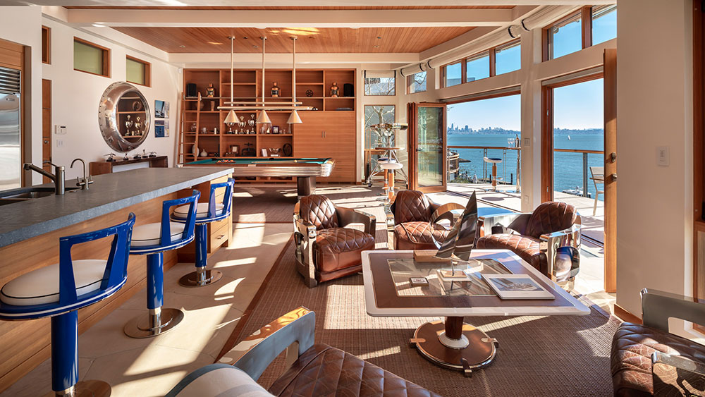 Reședința are în total trei dormitoare și patru băi. Multe dintre caracteristicile casei îți dau senzația că te afli pe un iaht, cum ar fi scaune de bar fixate, decor nautic de bun gust și pereți glisanți de sticlă care se deschid spre exterior, chiar și în „cabine”.
