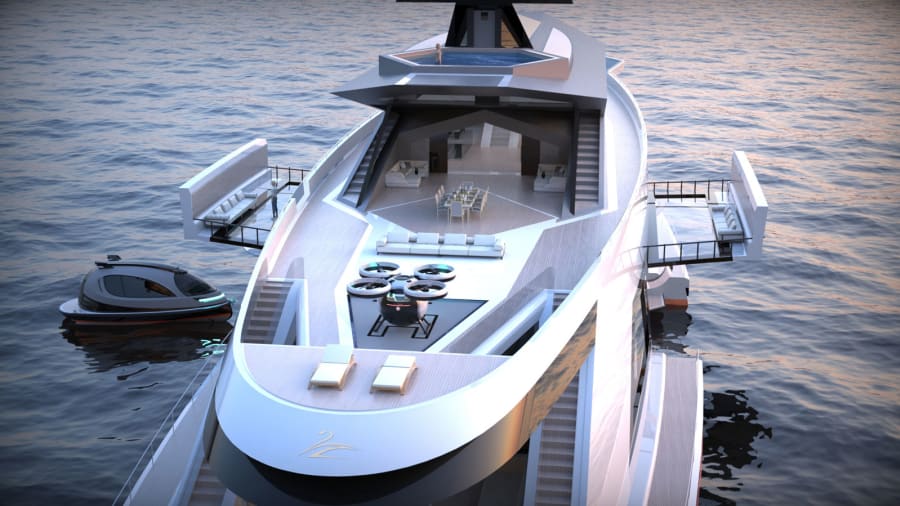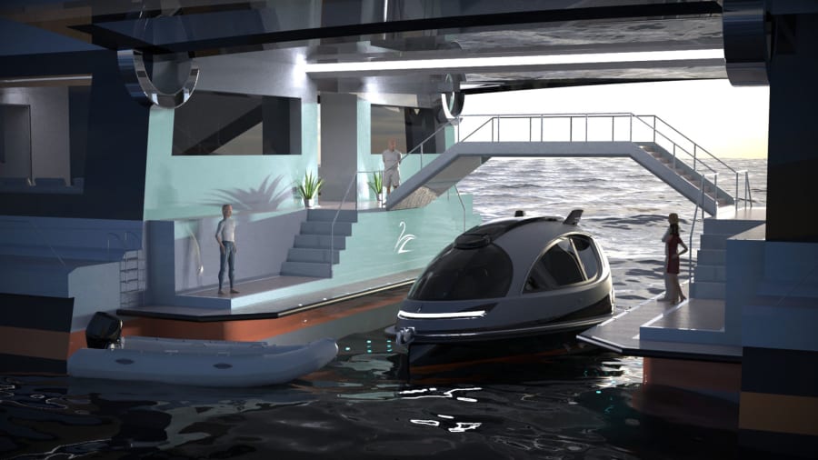 Portul navei ar permite ambarcațiunilor de până la 1,5 metri lungime să pătrundă prin două porturi pe partea laterală a iahtului și să acosteze în interiorul navei.