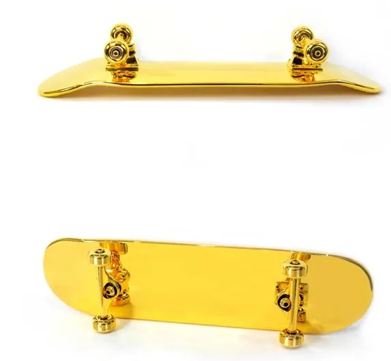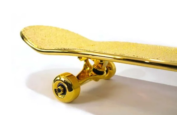 Obiectul sportiv este unicat în lume, spune producătorul. Fiind placat cu aur, skateboardul este mai greu decât unul normal, dar e perfect funcțional.