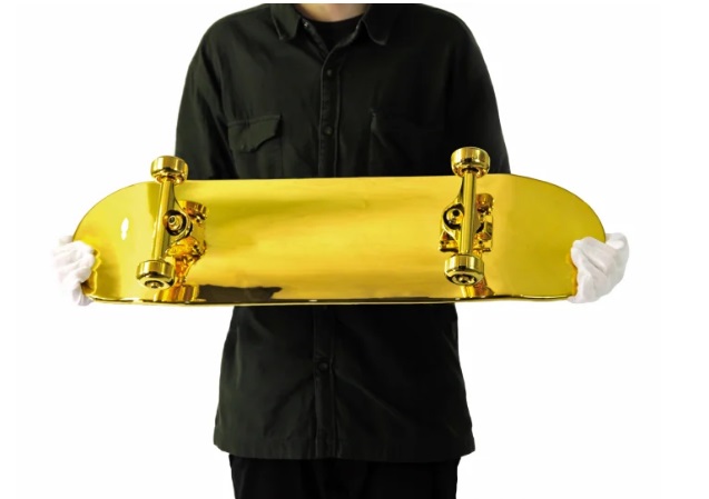 La un preț uimitor de 15.000 de dolari, skateboard-ul placat cu aur este disponibil acum în magazinul online SHUT și este livrat cu mănuși de colecție 100% bumbac.