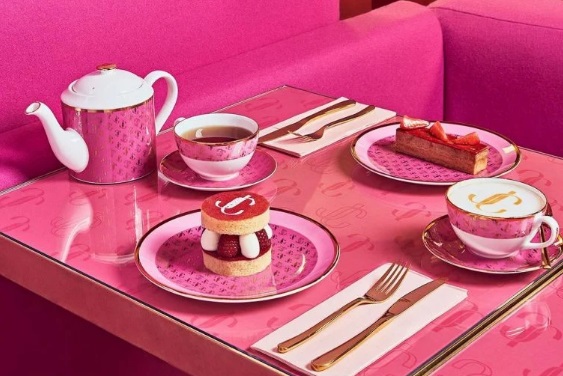 Oaspeții vor putea savura o gamă largă de produse de patiserie, cum ar fi prăjiturile mini-Victoria, cuburi de mousse de ciocolată și zmeură și éclairs cu căpșuni servite alături de cafea și șampanie. Toate deliciile sunt servite în vesela și tacâmurile de marcă într-o nuanță de roz viu.