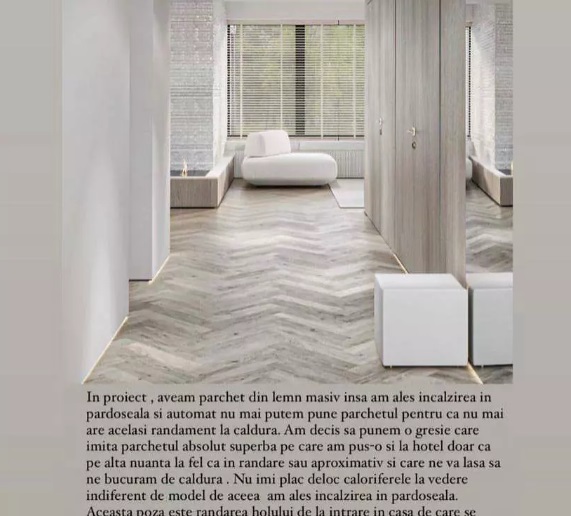 „În proiect, aveam parchet din lemn masiv, însă am ales încălzirea în pardoseală și automat nu mai putem pune parchetul pentru că nu mai are același randament la căldură. Am decis să punem o gresie care imită parchetul absolut superbă pe care am pus-o și la hotel doar că pe altă nuanță. Nu-mi plac deloc caloriferele la vedere indiferent de model de aceea am ales încălzirea în pardoseală”, a scris Andreea Bănică pe rețelele de socializare.