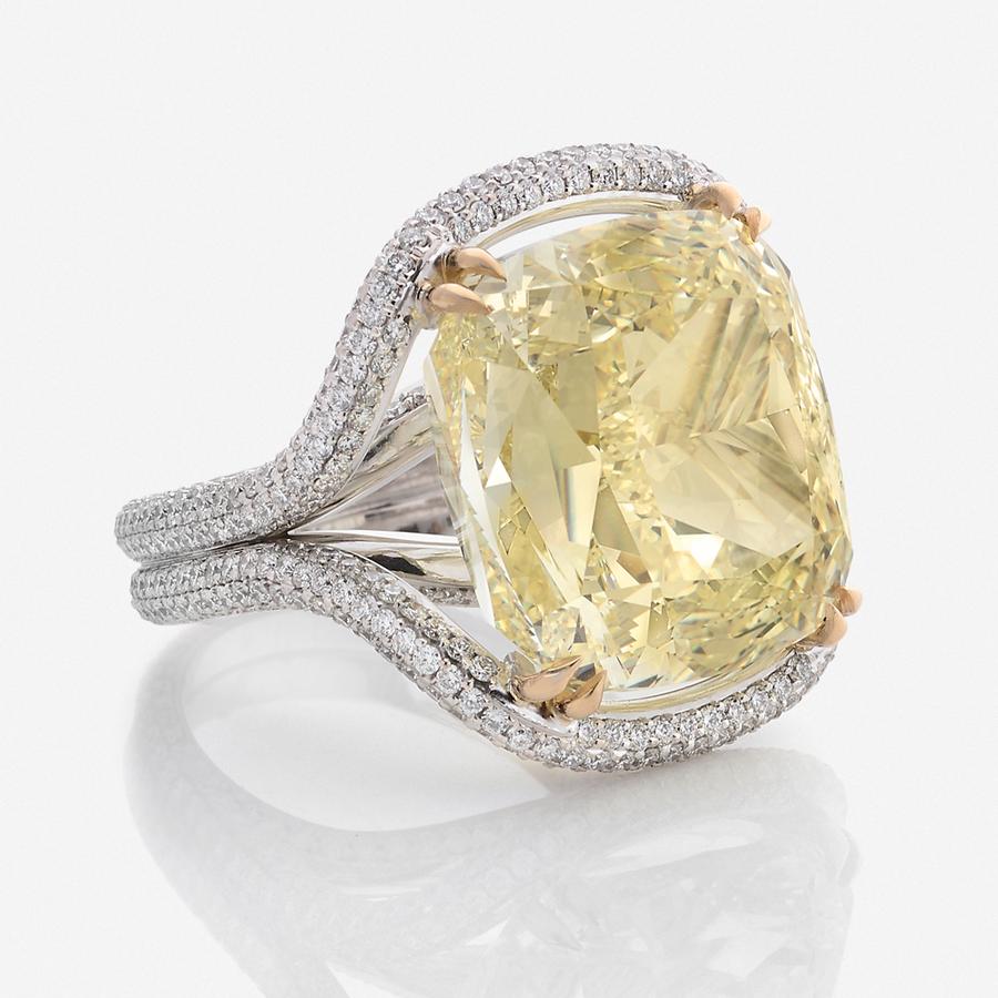Inel din aur alb, cu diamante între care unul galben de 29,02 carate. Preț estimativ: 380.000 - 420.000 €.