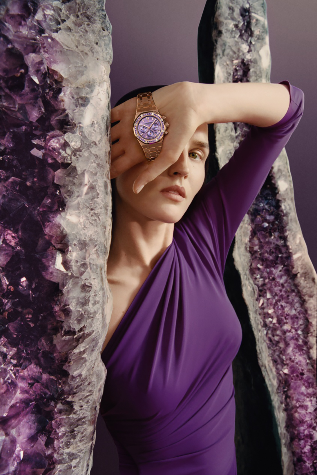 Royal Oak Selfwinding Chronograph în Amethyst este o combinație pentru care lumea nu era pregătită! Ceasul uimitor, solid, este realizat din aur roz de 18 carate, cu rama montată cu o gamă de ametiste tăiate în baghetă. Arată glorios și se potrivește complet cu tonurile atrăgătoare ale cadranului violet al ceasului. Ceasul se vinde cu 103.400 de dolari.