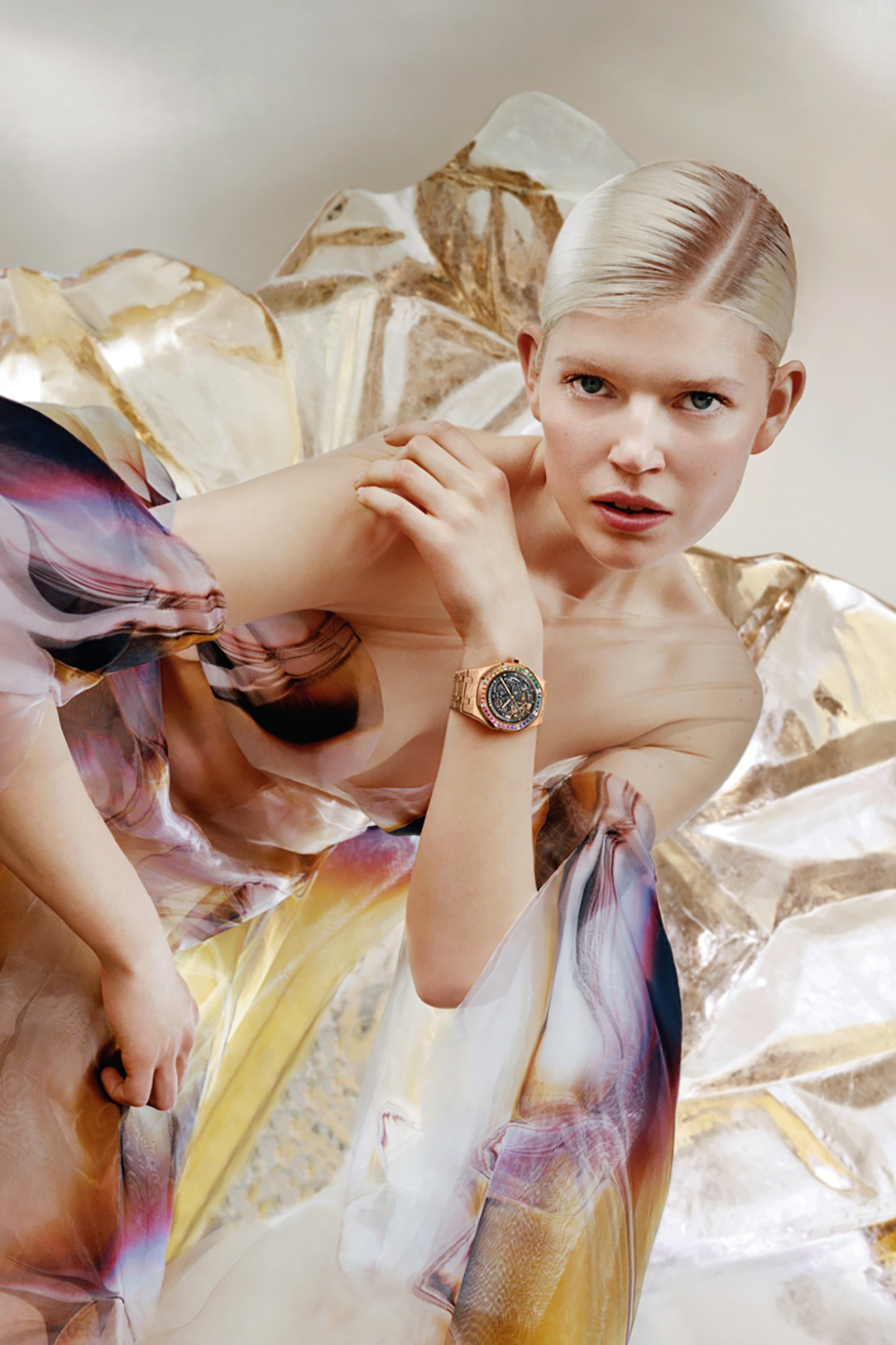 Seria Royal Oak Frosted Gold Double Balance Wheel Wheel Openworked vă va captiva cu trei referințe noi în 41mm și două în 37mm, toate cu rame curcubeu din pietre prețioase multicolore. Aceste creații perfecte vin în aur galben, alb sau roz, cu efect de îngheț pe rame și brățări. Interacțiunea culorilor, a materialelor și a decorațiunilor rafinate au redefinit în întregime lumea Haute Joaillerie și Haute Couture. Preț la cerere.