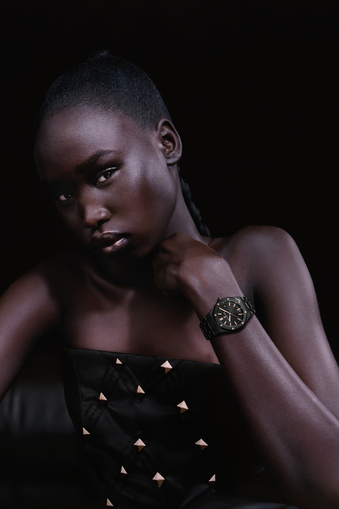 Royal Oak Selfwinding în ceramică neagră - Estetica elegantă a acestui model negru în 34 mm este completată cu accente de aur roz pentru un contrast rafinat în două tonuri. Royal Oak Selfwinding va fi realizat pentru încheieturi mai mici, în întregime din ceramică neagră. Royal Oak Selfwinding în ceramică neagră este vândut cu aproape 57.000 de dolari.