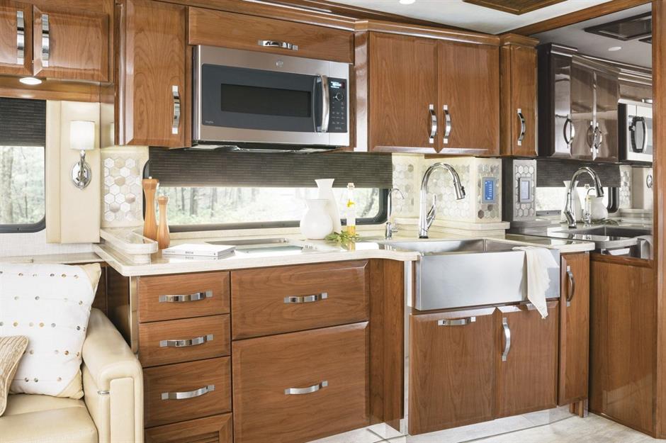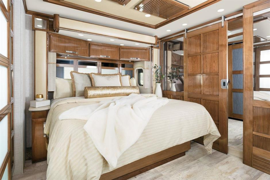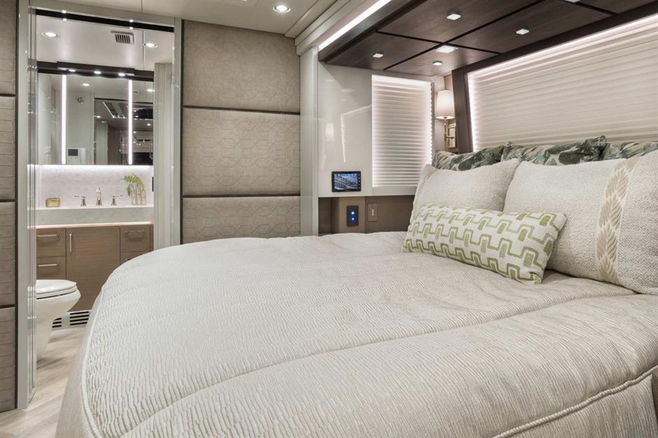 Pe lângă un spațiu de locuit luxuriant, 2020 King Aire este dotat cu o bucătărie de lux, echipată cu dulapuri din lemn tare de calitate și aparate de oțel inoxidabil de top. Alegerea perfectă pentru cei care se bucură de divertisment, modelul are chiar și un centru de divertisment în aer liber, care dispune de un frigider extragător, astfel încât să îți poți servi o sticlă de șampanie rece în orice moment. Dormitorul matrimonial cu pat king-size e completat de un televizor Samsung 4K retractabil și un sistem audio inedit.