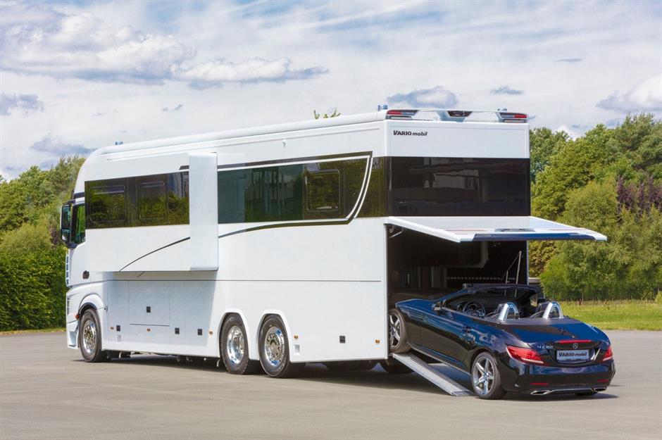 Garajul din spate al vehiculului are suficient spațiu pentru un Mercedes SL Roadster sau un Porsche 911, ceea ce vă permite să vă luați și mașina cu voi oriunde mergeți. Cu o greutate de 26 de tone, Vario Signature are o lungime de 39 de metri și se află pe o bază Mercedes Actros.
