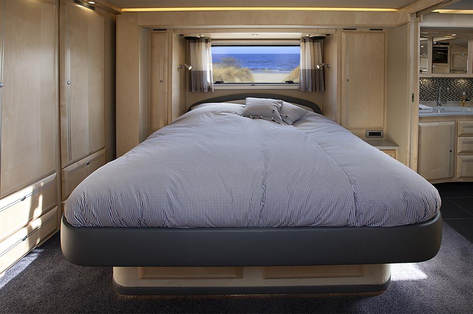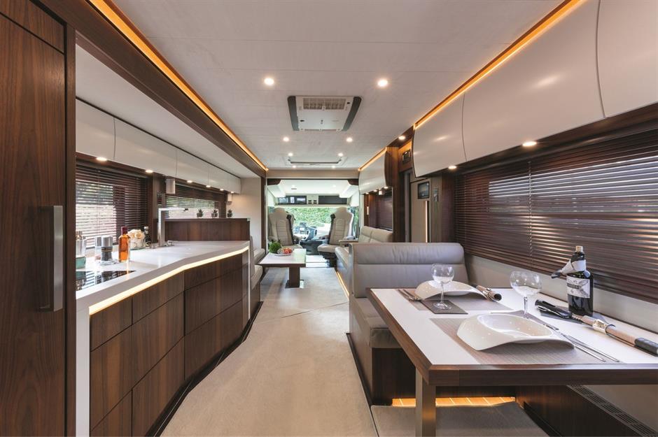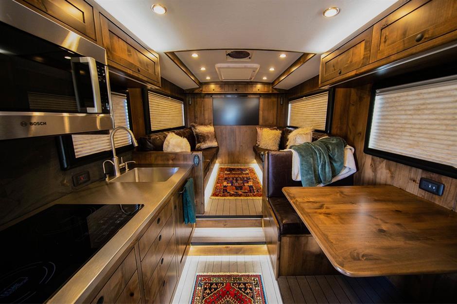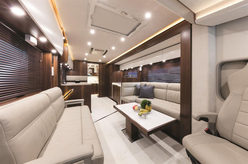 Pentru realizarea mobilierului luxuriant cu detalii moderne s-a folosit lemn de nuc și o paletă de culori naturale, în nuanțe de bej ceea ce îi conferă mult rafinament. Mai mult decât atât, vehiculul dispune de tracțiune constantă, un sistem de camere de 360 de grade și asistență pentru șofer. Fiecare autovehicul este făcut la comandă. Dormitorul principal seamnă cu o cameră de hotel de 5 stele. De asemenea, există o mulțime de spații pentru oaspeți, cu zone de dormit separate pentru șase persoane.
