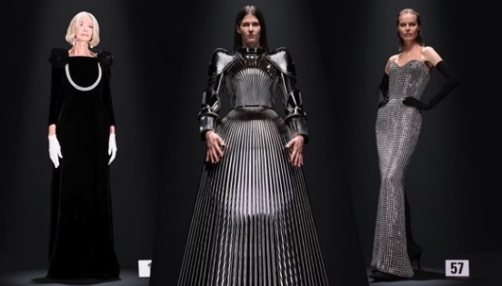 Covor din pâslă, scaune aurite și perdele groase... toate ingredientele haute couture par să se reunească la începutul după-amiezii în saloanele Balenciaga. Parada este deschisă chiar de Danielle Slavik, un fotomodel în vârstă de 79 de ani, care a lucrat cândva cu maestrul.