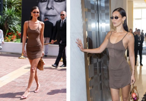 Bella Hadid a sosit în sudul Franței pentru apariția ei foarte așteptată la Festivalul de Film de la Cannes. Tânăra a fost văzută duminică, 19 mai, bucurându-se de vremea însorită într-o rochie mini în tonuri de maro care i-a scos în evidență picioarele. Rochia ei de vară se remarcă prin bretele spaghetti, precum și cu cusăturile de sub bust și de la șolduri — care dau iluzia unui corset fals.