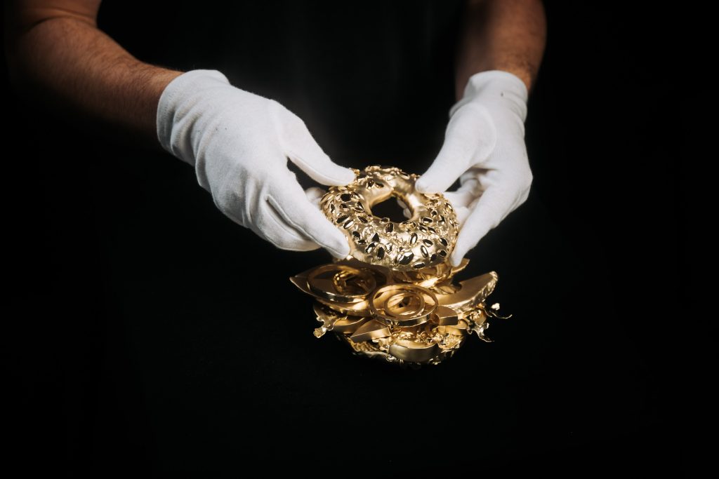 Covrigul de aur - aurul ar fi putut fi orice alt material, dar cu siguranță nu ar fi stârnit atâta agitație - este scos la imprimanta 3D. Autorul este artistul milenar Tim Bengel, în vârstă de 29 de ani. El a conceput sandvișul foarte special ca un simbol al etosului milenar.
