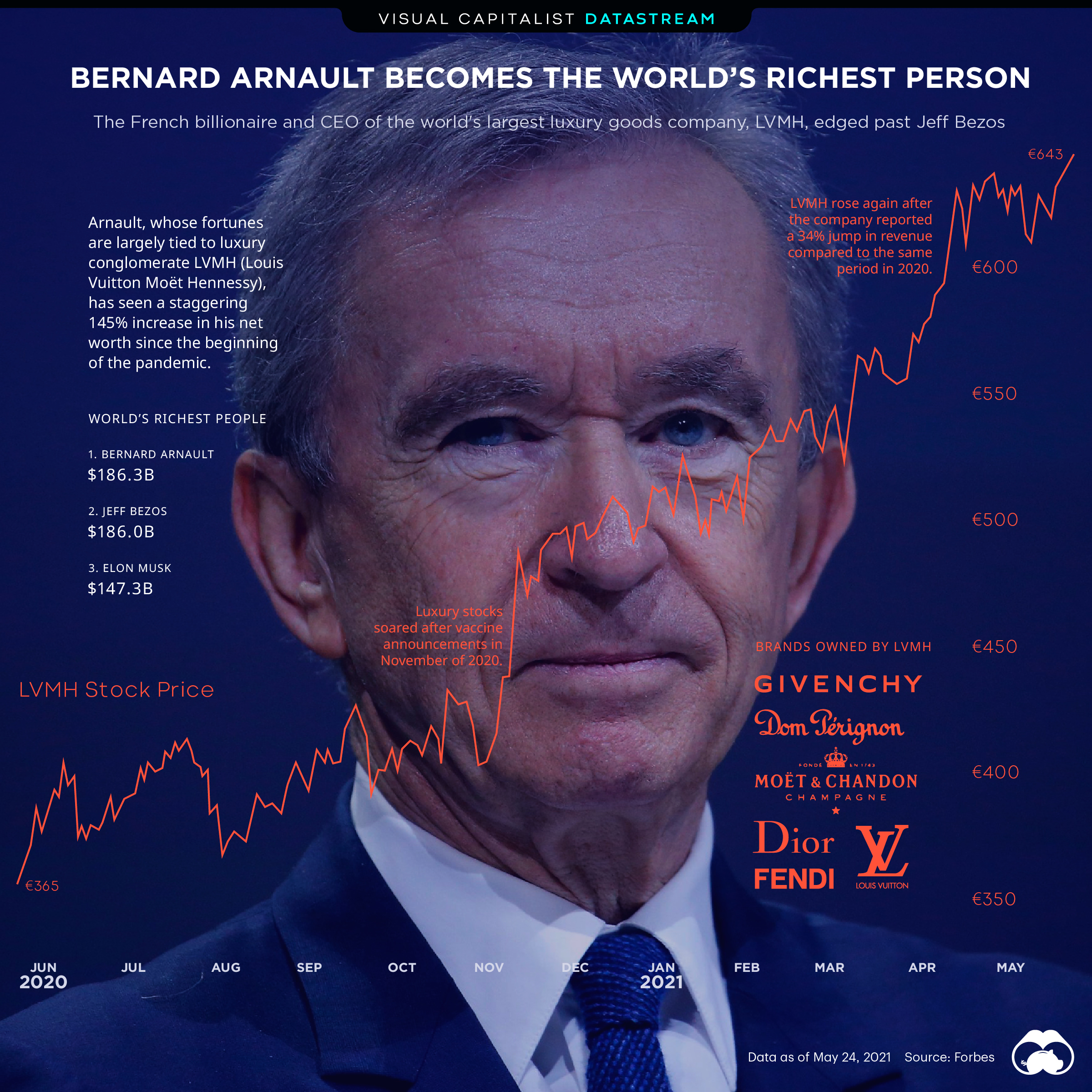 Dacă această creștere e impresionantă și suficientă pentru a destabiliza ierarhia bogăției mondiale, atunci faptul că averea lui Bernard Arnault a ajuns la 186,3 miliarde de la 76 de miliarde anul trecut este de-a dreptul șocant. Arnault a câștigat 110 miliarde de dolari în 2020. În pandemie.