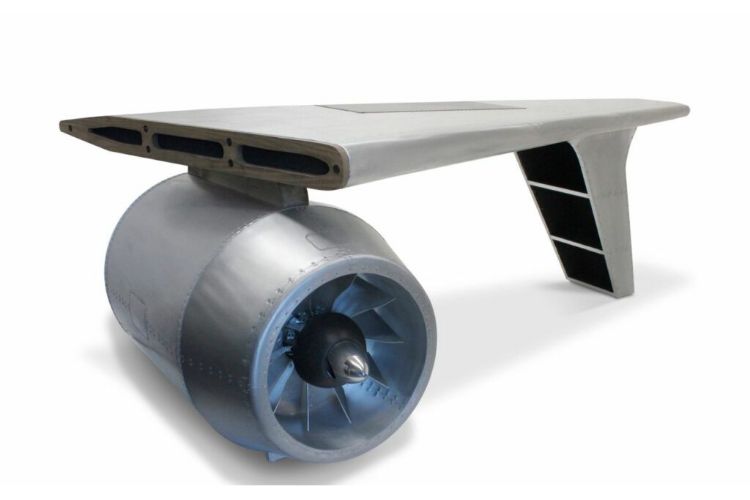 Amplasat pe un singur picior și motor cu reacție, biroul este realizat manual cu măiestrie pentru a prezenta o piesă de mobilier unică. În imagini, puteți vedea cu ușurință șuruburile din oțel inoxidabil de-a lungul cusăturilor carenului din aluminiu satinat care simulează niturile aeronavelor vechi. Suprafața biroului are un bloc de scris din piele neagră cu cuie fine, oferind un design centrat pe utilizator.