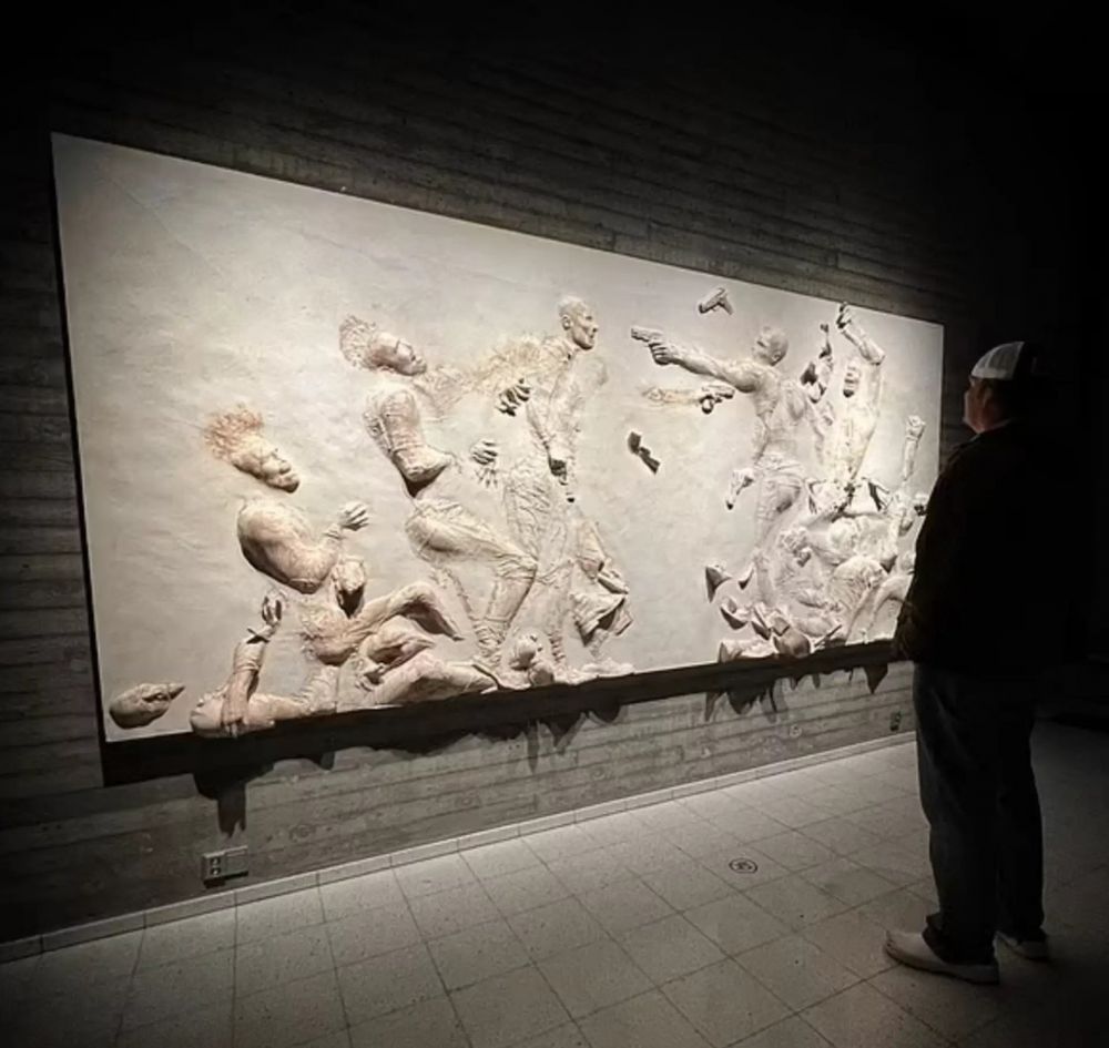„Pentru Nick şi pentru mine, aceasta este o lume nouă şi prima noastră expunere. Pur şi simplu este grozav”, a spus Pitt pentru postul finlandez Yle la vernisaj. Cele nouă lucrări ale lui Pitt din expoziţie includ un panou de ipsos turnat „care înfăţişează o luptă cu arme” şi o serie de sculpturi din silicon în formă de casă.