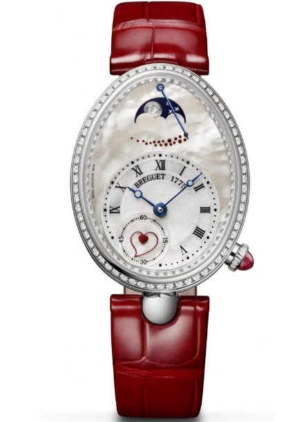 Și apoi din nou ca o mână lăcuită cu inimă dublă în sub-cadranul secundelor mici la ora 6. Ceasul acum oval (anterior, formă alungită) este o odă adusă feminității. Este inspirat de primul ceas de mână din istorie, livrat în 1812 surorii lui Napoleon, Caroline Murat. Cadranul cerurilor nu poate fi complet fără lună. Ceasul Reine de Naples prezintă un afișaj cu fazele lunii, realizate din aur alb.