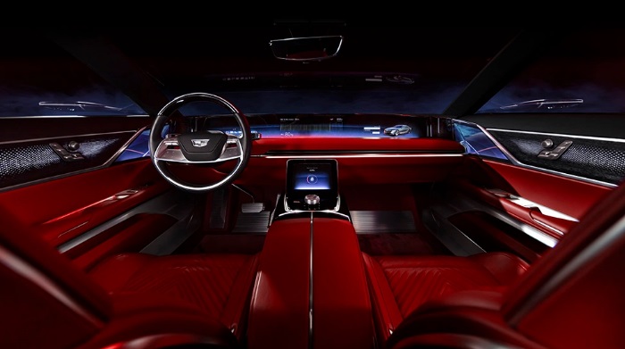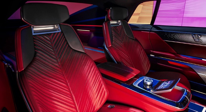 Cei din spate primesc un ecran tactil propriu pe spatele ambelor tetiere din față, precum și altul pe consola centrală. Există, de asemenea, un „acoperiș de sticlă inteligent”, care este împărțit în patru zone, fiecare dintre acestea oferind niveluri personalizabile de transparență și iluminare pentru toată lumea din interiorul vehiculului. Tot ceea ce nu este paravan este acoperit cu metal sau piele roșie.