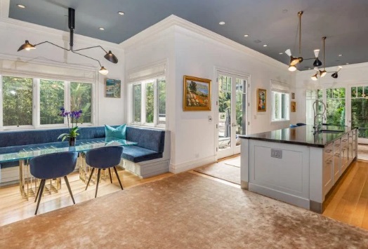 Amenajată cu bun gust: locuința cu șase dormitoare și șase băi are o intrare formală din sticlă, împreună cu tavane înalte și pereți văruiți. Are o bucătărie cu o bancă masivă de marmură și aparate Wolf și Sub-Zero de top.