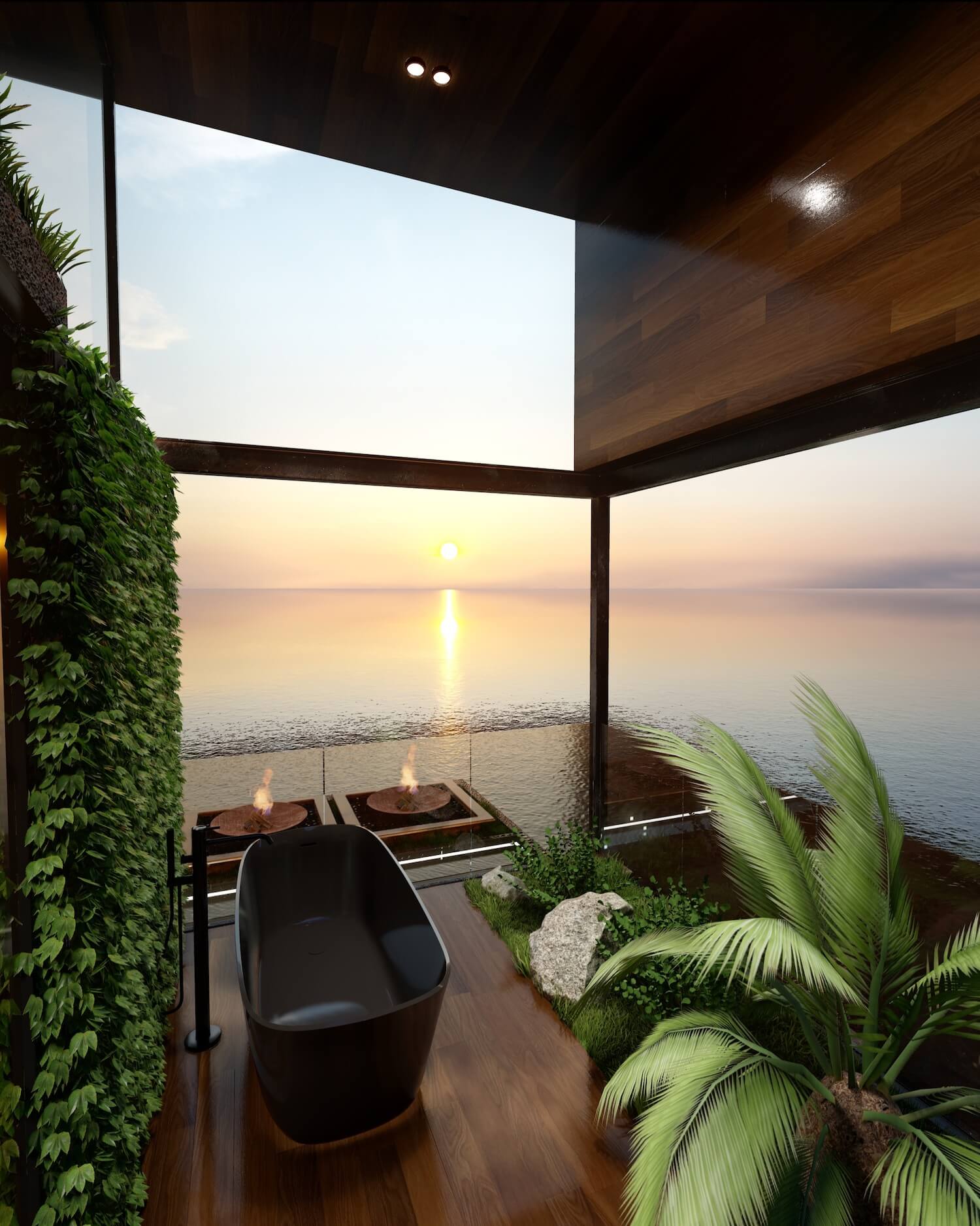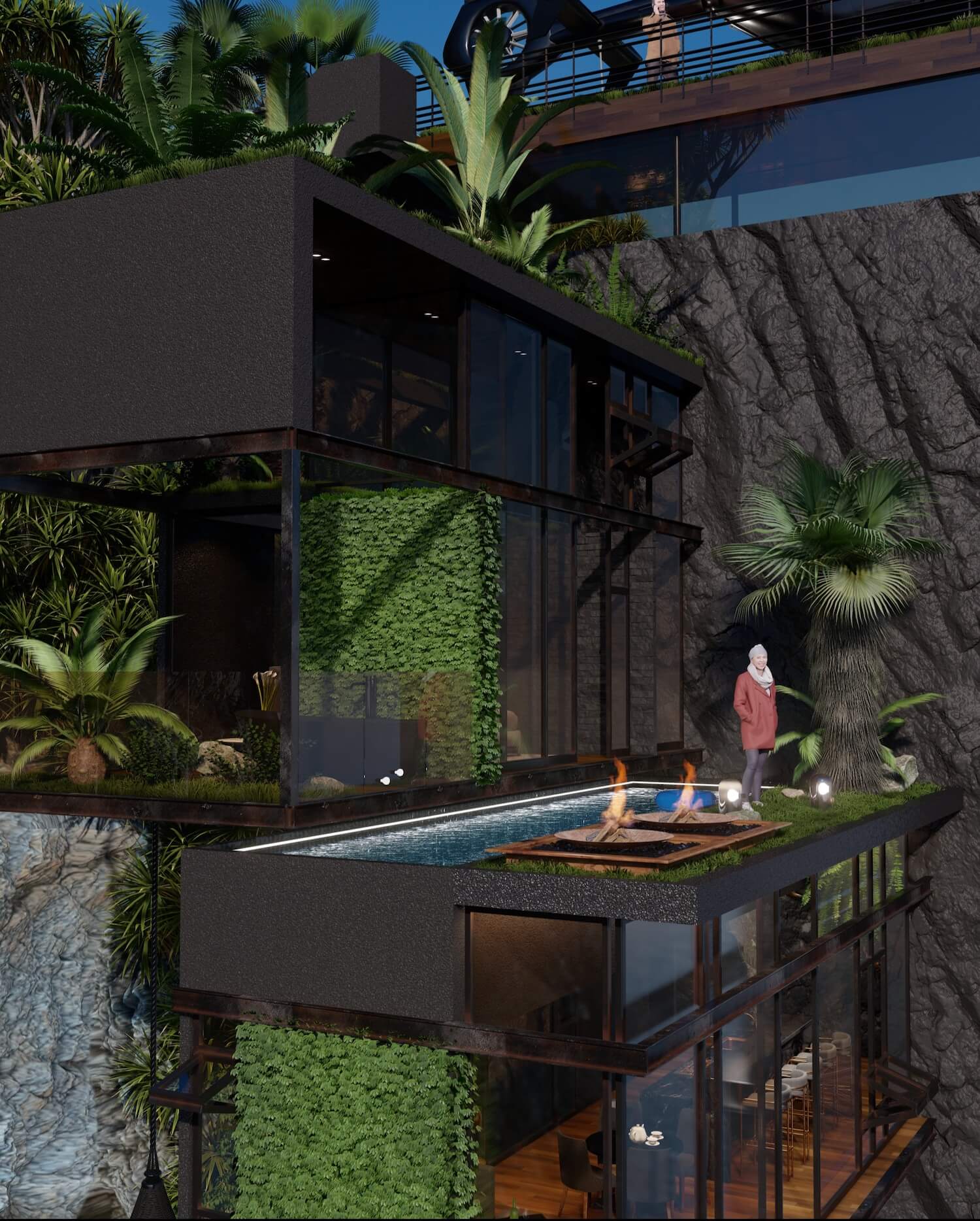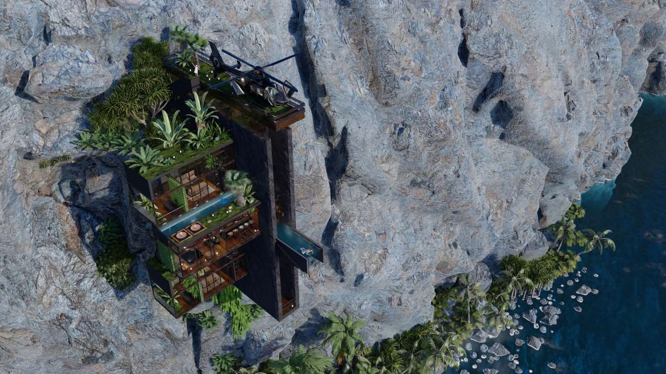 Proiectată pentru a oferi vederi uluitoare ale naturii, casa are ferestre din podea până în tavan, care oferă vedere panoramică la ocean și briza de pe coastă. Ele se extind în continuare la o piscină în consolă care pare a fi construită chiar la marginea stâncii.