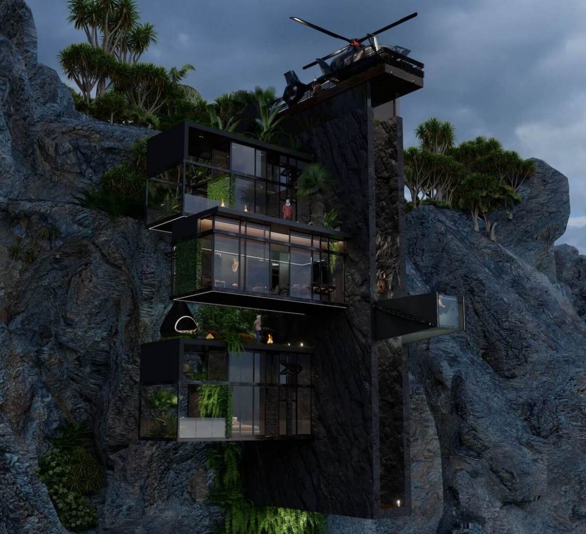 Reședința are, de asemenea, o scară și un lift care leagă două dormitoare și o zonă de bucătărie cu o cameră TV. Alte caracteristici demne de remarcat includ un punct de vedere care, la rândul său, funcționează ca un heliport - singura modalitate probabil posibilă de a ajunge aici fiind cu un elicopter privat.
