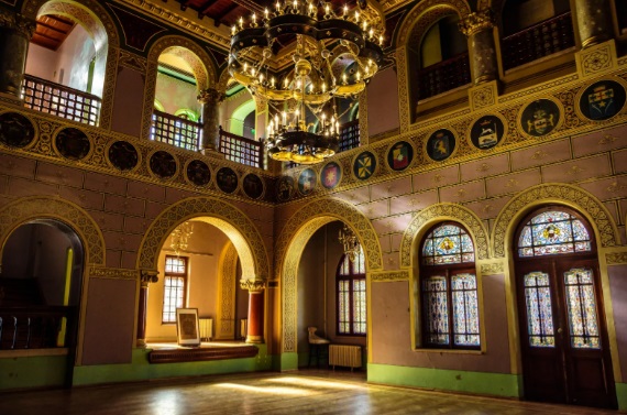 Cel mai notabil spațiu al castelului poate fi sala de bal cu o galerie de portrete a strămoșilor lui Cantacuzino pe piele de Cordoba, o altă galerie împodobită cu stemele a 27 de membri ai familiei și două galerii cu fresce. Toate aceste caracteristici sunt evidențiate de singurul corp de iluminat original rămas din casă: un candelabru de peste 900 kg, care este o replică a originalului mult mai mare agățat în Hagia Sofia din Istanbul.