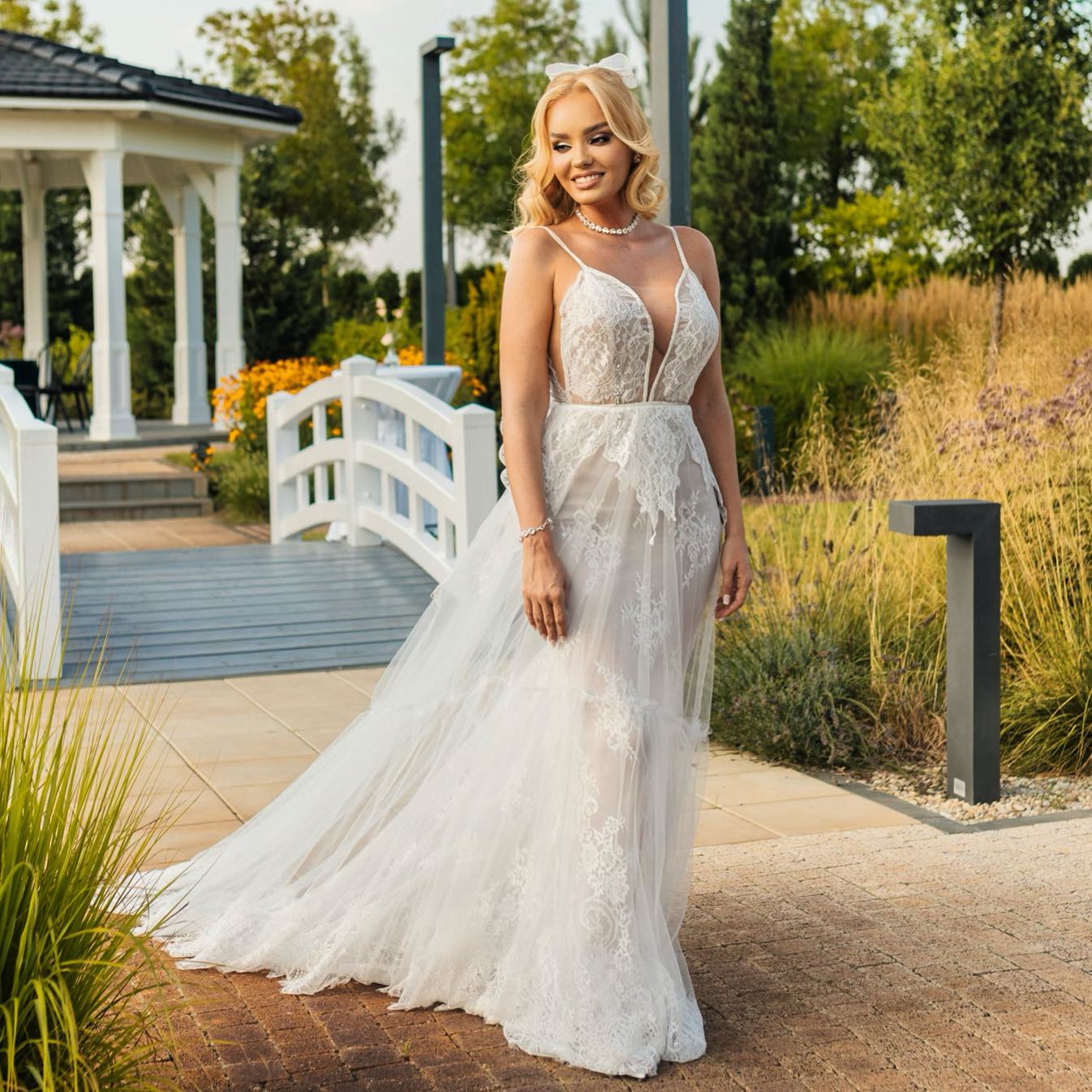 A îmbrăcat o rochie din dantelă, cu diamante, decoltată în partea din spate și transparentă în partea de jos. Florin Burescu, cel care a creat ținuta, a explicat că 9.000 de euro valorează rochia de mireasă a Mariei Constantin.