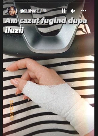 De curând, Gina Pistol a postat o imagine cu mâna bandajată, alături de mesajul: „Am căzut fugind după iluzii'. Ulterior, vedeta a venit cu o precizare, explicând faptul că a alunecat pe confetti.