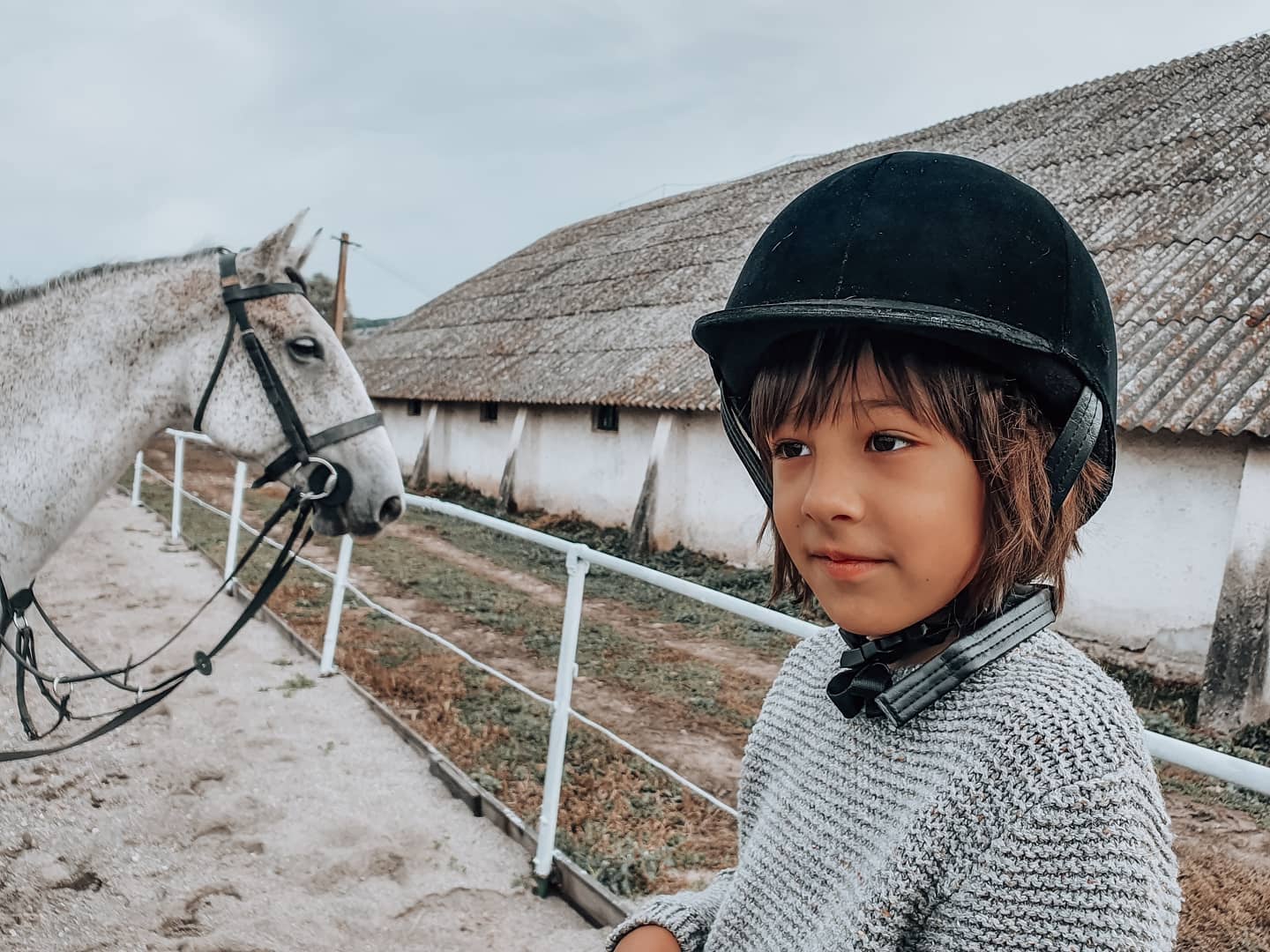 "Hai să mergem la cai, să călărim!" - a fost primă replică a lui Vlad în dimineața asta, pe la 6, când era încă întuneric afară, iar eu aș fi dat orice să mai dorm puțin în rulota încălzită. Știa că vorbisem cu cei de la ferma de cai din Viscri să facă azi o primă lecție de echitație cu amândoi. Vlad se mai suise pe cal în tabăra și îi plăcuse. Se mai suise și când era mai mic, dar nu mai ține minte. Iar azi era extrem de entuziasmat să o facă din nou. A alergat până la fermă, și-a ales o cască pe măsură capului sau, și a cerut să se urce primul, înaintea mea. I-am făcut fotografia pe care o vedeți și mi-a zis: "Să îmi faci poze și când sunt pe cal, da?".