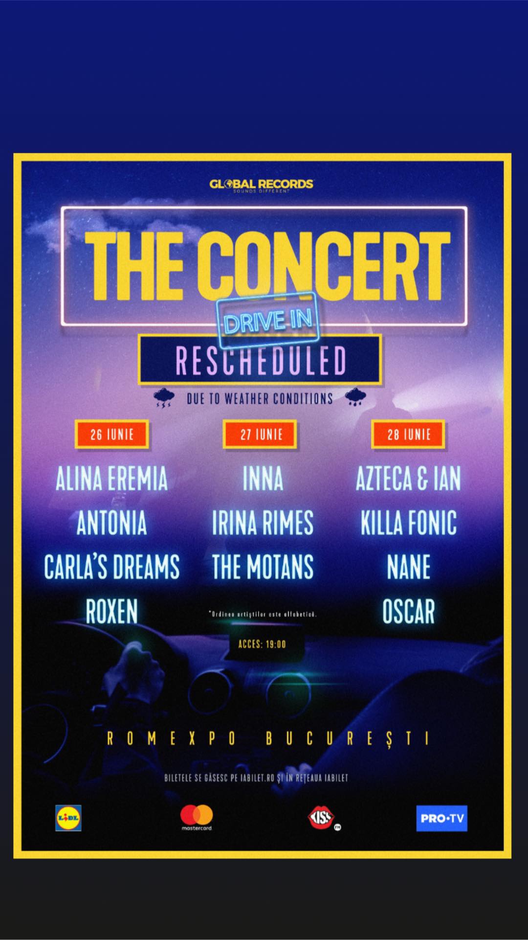 prognozei pentru următoarele zile. Evenimentul "THE CONCERT drive-în" va fi amânat o săptămână și va avea loc pe 26, 27 și 28 iunie, în parcarea principală de la Romexpo. Deoarece experiența THE CONCERT drive-în a fost gândită în detaliu, pentru că publicul să se poată