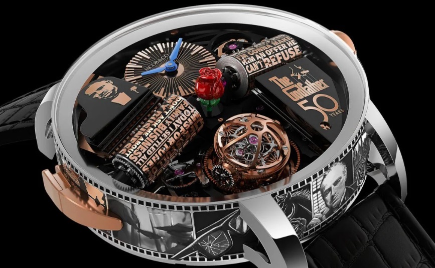 The Jacob & Co. Opera Godfather 50th Anniversary este o capodoperă tehnică și vizuală la fel ca filmul căruia îi aduce un omagiu. Frumosul ceas de mână este decorat cu redări artistice a 13 scene iconice din filmul cult.
