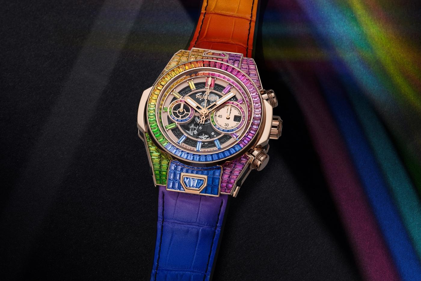 Fața sclipitoare a acestui ceas Hublot, asemănătoare cu bijuteriile, arată ca desprins din poveștile cu regi și regine. Un total de 290 de pietre prețioase în toate culorile curcubeului - rubine, safire roz, ametiste, safire albastre, topaze albastre, tsavorite și safire galbene și portocalii - se amestecă într-un cadran auriu.