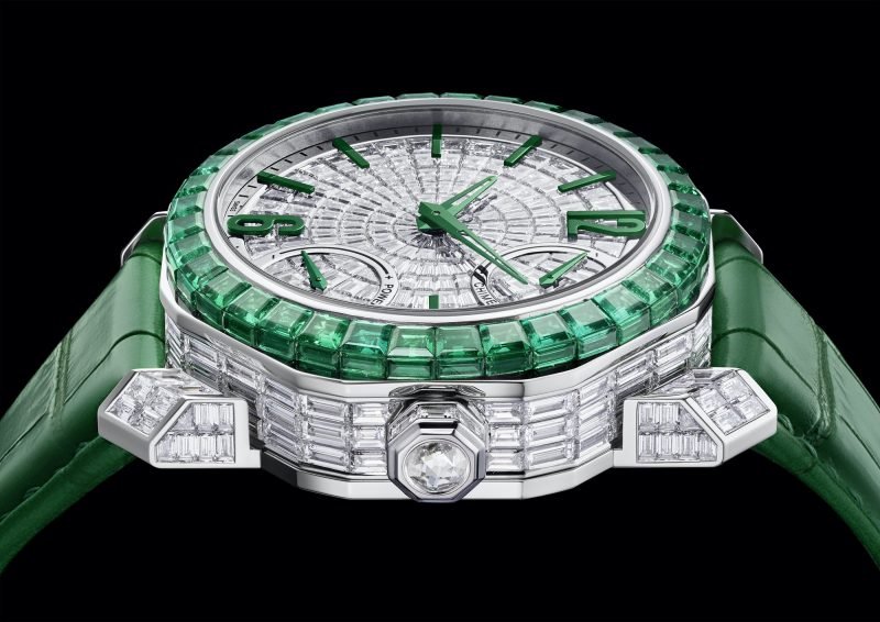 Ceasul personalizat are o curea din piele de aligator verde vibrant pentru a completa smaraldele de pe lunetă și are o închidere pliabilă din aur alb cu patru rânduri de diamante tăiate baghetă. Bvlgari Octo Roma Emerald Grande Sonnerie este o piesă unică și are un preț de 1,6 milioane de euro (aproximativ 1,8 milioane de dolari).