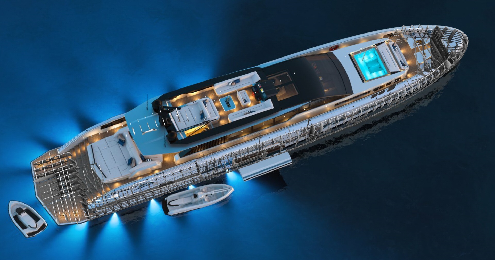 Superyacht-ul este sportiv atât în interior, cât și în exterior și complet sincronizat cu ADN-ul mărcii. Conform Boat International, exteriorul are o carenă subțire și un flybridge integrat, prin amabilitatea lui Guido de Groot.