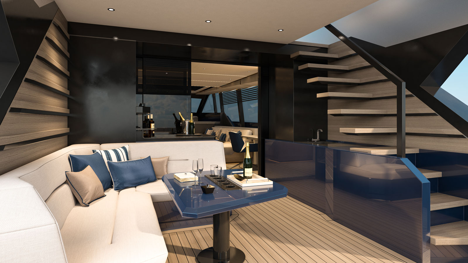 Potrivit șantierului naval, VQ115 Veloce „va permite grupurilor mari de oameni să se distreze, să se bucure de șederi prelungite la bord și să profite de o gamă largă de sporturi nautice”. Vasul prezintă un aspect interior atrăgător. Punțile sunt împărțite între un salon principal flexibil, o suită principală cu fascicul complet și o cabină VIP și oaspeți, toate cu băi proprii. Există o largă utilizare a combinațiilor nautice, care sunt atât liniștitoare, cât și sportive!