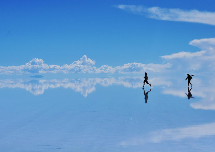Vizitând Salar de Uyuni, cel mai mare munte de sare din lume, simți că te plimbi printre nori. După ploi, apa de pe suprafața sărată a lacului creează o iluzie lucioasă, asemănătoare sticlei, transformând lacul într-o oglindă care reflectă cerul de deasupra.